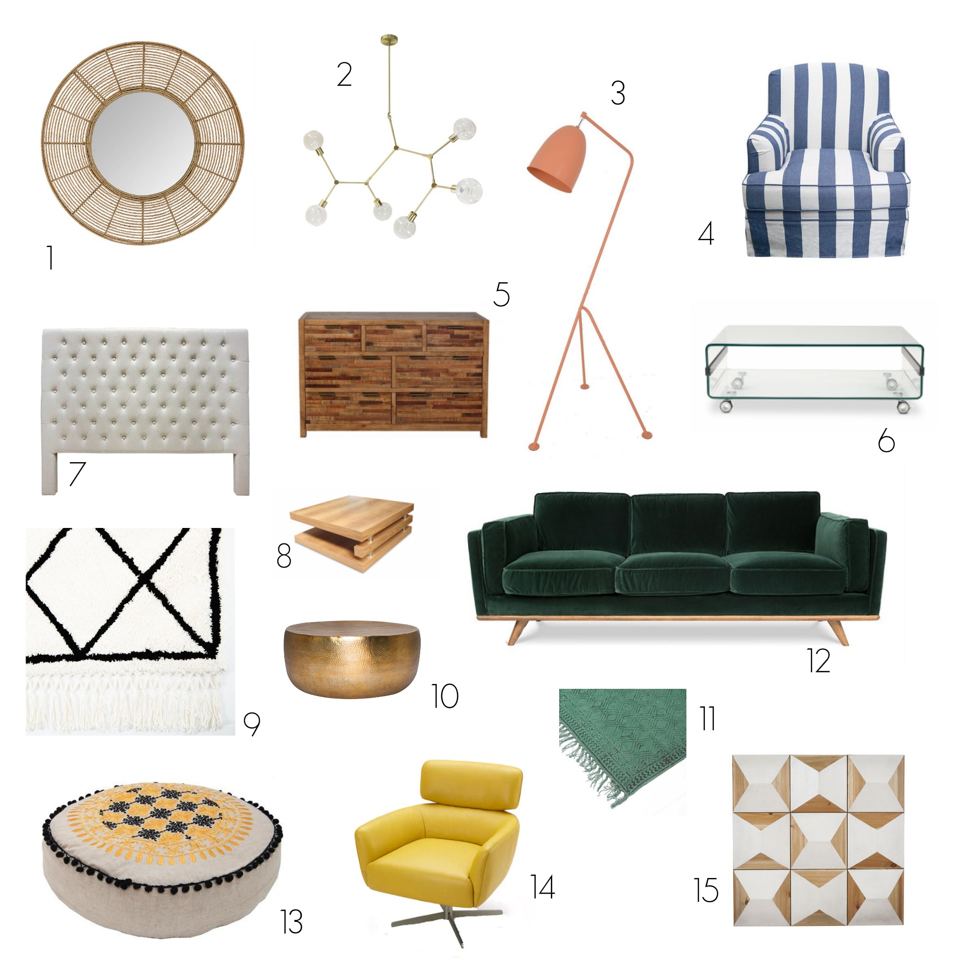 - Noeline mirror $319 by Freedom 2. Padua 6 light pendant in brass $307.30* by Lighting Plus 3. Bloom Floor Lamp in sunset $94.50* by Lighting Direct 4. Cottage fabric armchair $695 by The Importer 5. Jakarta dresser $1199.00 by The Bed Shop 6. Ander coffee table $1049 by Hunter Furniture 7. King Heinrich headboard $249.90 by Bed Bath & Beyond 8. Juno coffee table $1199 by Hunter Furniture 9. Diamond Morroccan rug $199.90 by Bed Bath & Beyond 10. Hammered drum coffee table $699 by Freedom Furniture 11. Minted diamond rug $40 by The Importer 12. Dahlia 3 seater sofa $2399 by Freedom Furniture 13. Spectra emrboidered pouffe $75 by The Importer 14. Malibu Clifton Chair $1599 by Harvey Norman 15. Geometric wood panel $149.50 by Nood